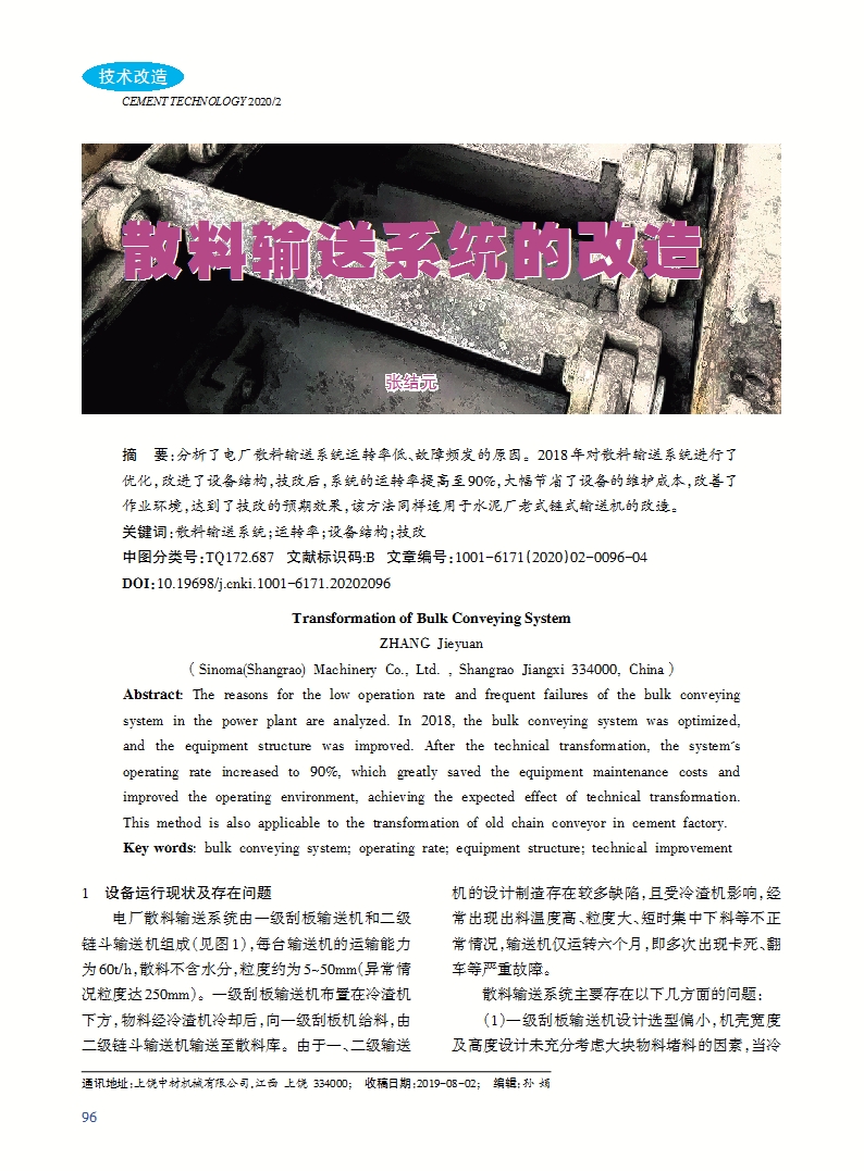 摘要 分析了电厂散料输送系统运转率低、故障频发的原因。2018年对散料输送系统进行了优化,改进了设备结构,技改后,系统的运转率提高至90%,大幅节省了设备的维护成本,改善了作业环境,达到了技改的预期效果,该方法同样适用于水泥厂老式链式输送机的改造。