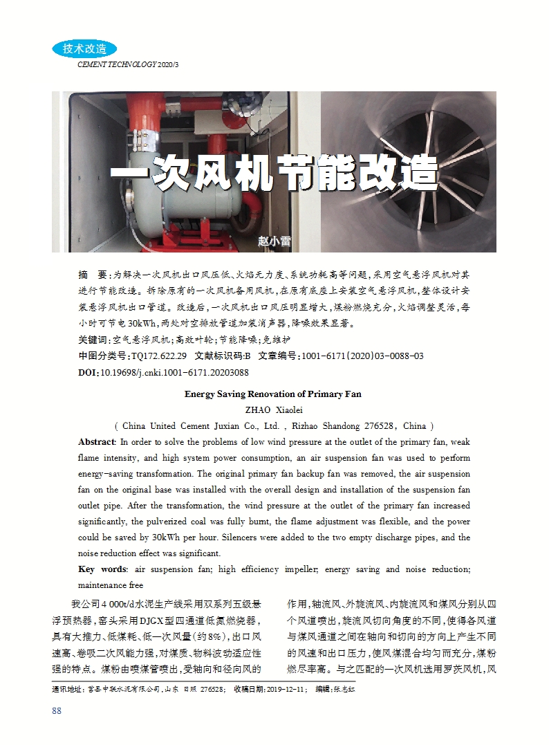 ZHAO Xiaolei. Energy Saving Renovation of Primary Fan . Cement Technology, 2020, 1(3): 88-90.