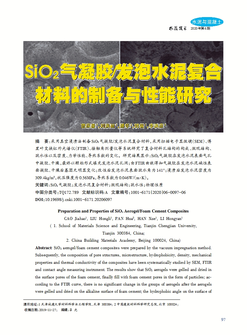 CAO Jiahao, LIU Hongli, PAN Hua, HAN Xue, LI Hongyan. Preparation and Properties of SiO2 Aerogel/Foam Cement Composites. Cement Technology, 2020, 1(6): 97-102.