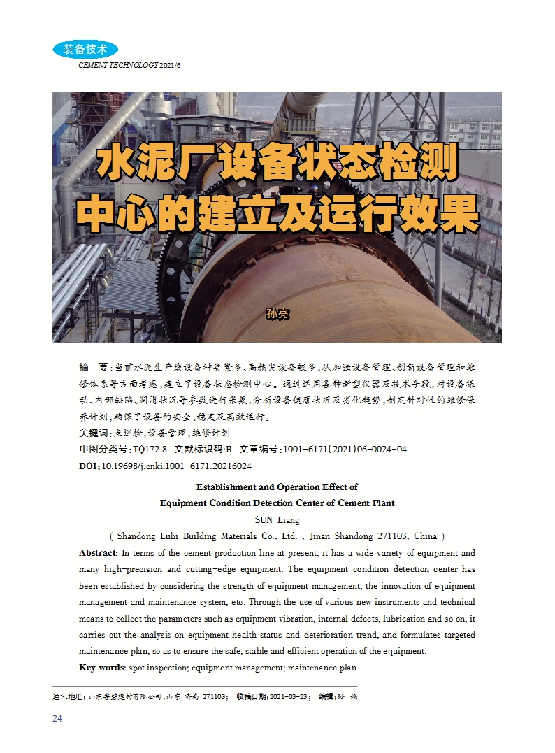 Abstract: In terms of the cement production line at present, it has a wide variety of equipment and many high-precision and cutting-edge equipment. The equipment condition detection center has been established by considering the strength of equipment management, the innovation of equipment management and maintenance system, etc. Through the use of various new instruments and technical means to collect the parameters such as equipment vibration, internal defects, lubrication and so on, it carries out the analysis on equipment health status and deterioration trend, and formulates targeted maintenance plan, so as to ensure the safe, stable and efficient operation of the equipment.
