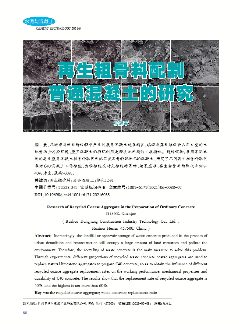 ZHANG Guanjun. Research of Recycled Coarse Aggregate in the Preparation of Ordinary Concrete. Cement Technology, 2021, 1(6): 88-94.
