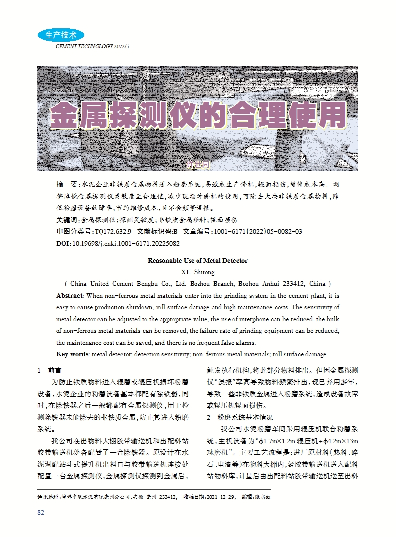 摘要 水泥企业非铁质金属物料进入粉磨系统,易造成生产停机,辊面损伤,维修成本高。调整降低金属探测仪灵敏度至合适值,减少现场对讲机的使用,可除去大块非铁质金属物料,降低粉磨设备故障率,节约维修成本,且不会频繁误报。