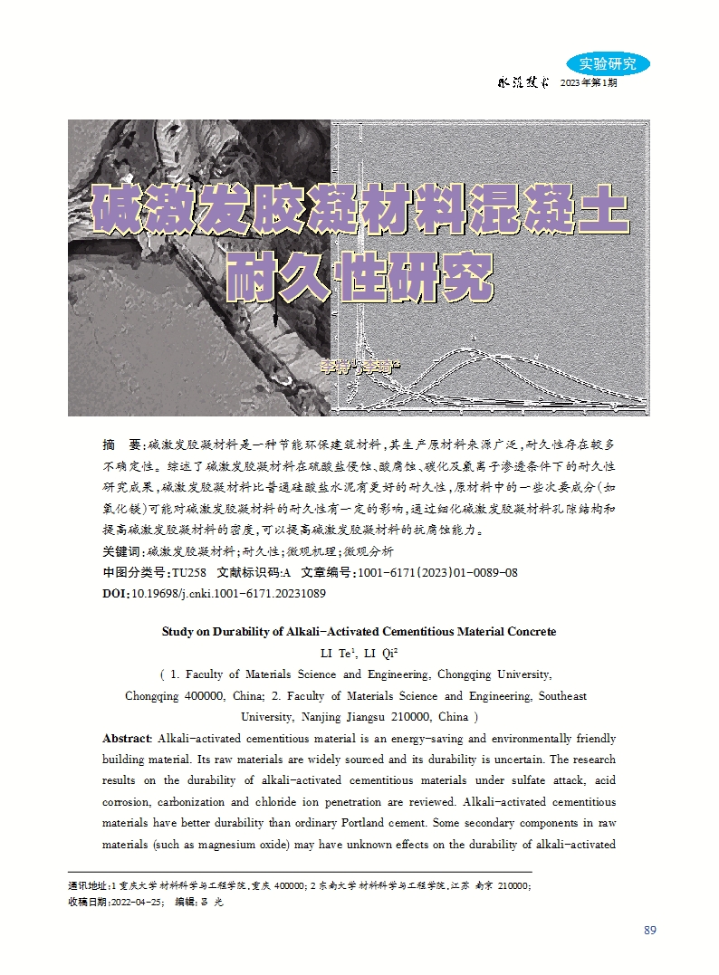 李特, 李琦. 碱激发胶凝材料混凝土耐久性研究[J]. 水泥技术, 2023, 1(1): 89-96.