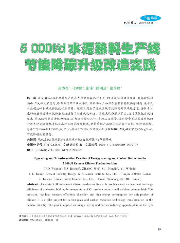 Upgrading and Transformation Practice of Energy-saving and Carbon Reduction for 5 000t/d Cement Clinker Production Line