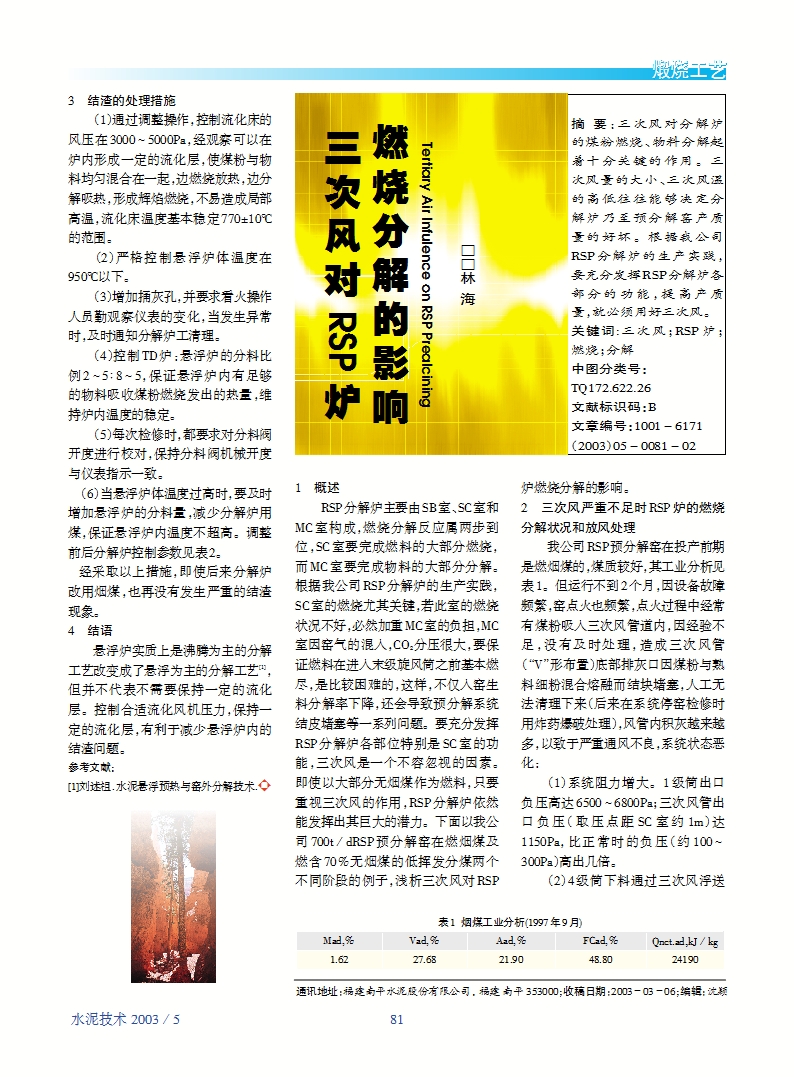 LIN Hai. Tertiary Air Infulence on RSP Prealcining. Cement Technology, 2003, 1(5): 81-82.