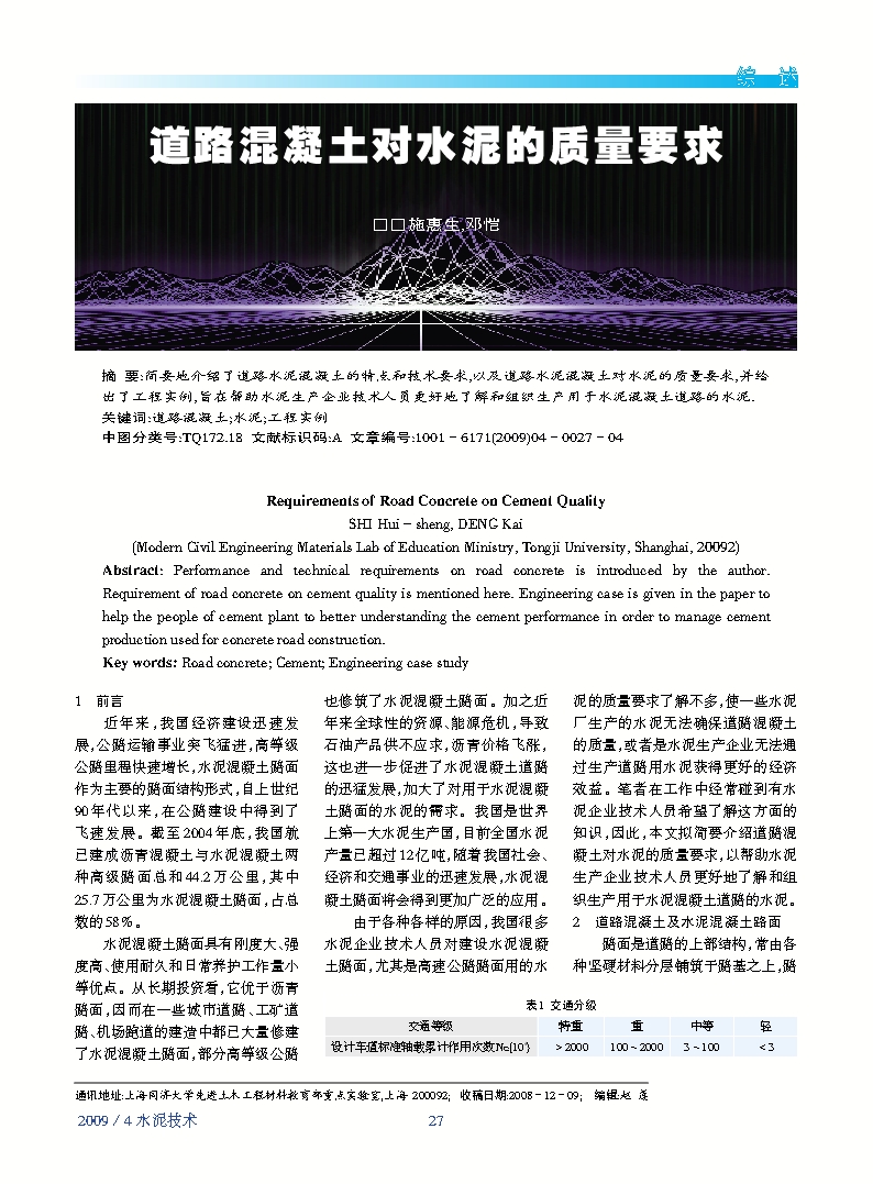 Abstract: Performance and technical requirements on road concrete is introduced by the author. Requirement of road concrete on cement quality is mentioned here. Engineering case is given in the paper to help the people of cement plant to better understanding the cement performance in order to manage cement production used for concrete road construction.