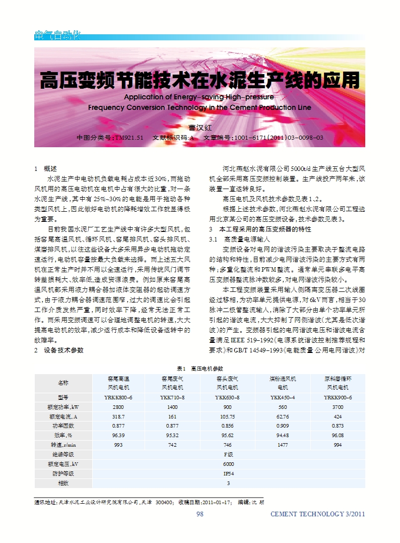 Application of Energy-saving High-pressure Frequency Conversion Technology in the Cement Production Line