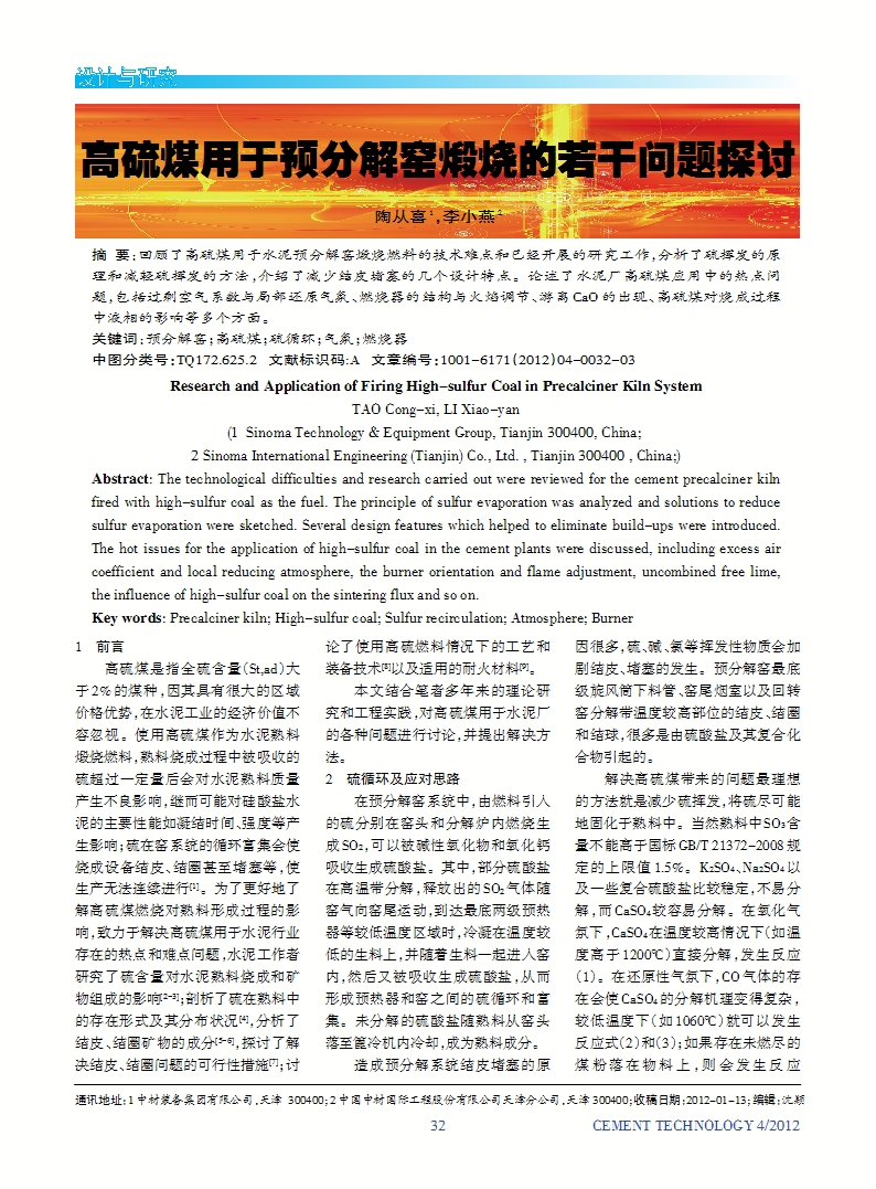 高硫煤用于预分解窑煅烧的若干问题探讨