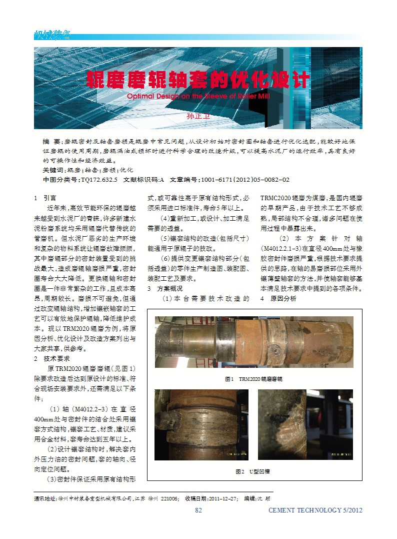 孙正卫. 辊磨磨辊轴套的优化设计[J]. 水泥技术, 2012, 1(5): 82-83.
