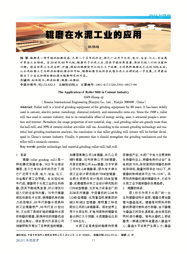 Abstract: Roller mill is a kind of grinding equipment of the grinding equipment for 80 years. It has been widely used in cement, electric power, metallurgy, chemical industry, and nonmetallic mine etc. Since the 1960 s, roller mill was used in cement industry, due to its remarkable effect of energy saving, soon it attracted people's attention and interest. Nowadays, the usage proportion of raw material, slag , coal grinding roller are greatly more than the ball mill, and 30% of cement clinker are roller mill too. According to the cement grinding technology and material bed grinding mechanism analysis, the conclusion is that roller grinding mill system will be further developed in China's cement industry. Finally, it presents that it should strengthen the grinding mechanism and the roller mill's research contents.