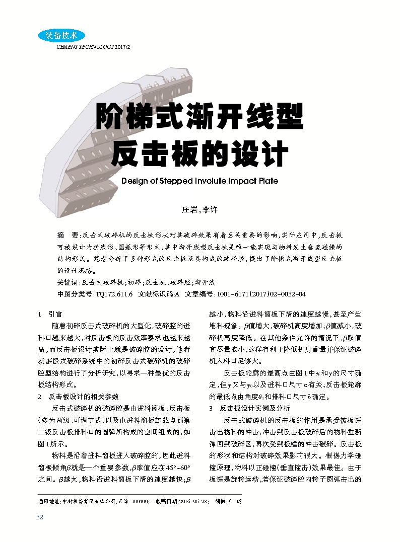 摘要 反击式破碎机的反击板形状对其破碎效果有着至关重要的影响,实际应用中,反击板可被设计为折线形、圆弧形等形式,其中渐开线型反击板是唯一能实现与物料发生垂直碰撞的结构形式。笔者分析了多种形式的反击板及其构成的破碎腔,提出了阶梯式渐开线型反击板的设计思路。