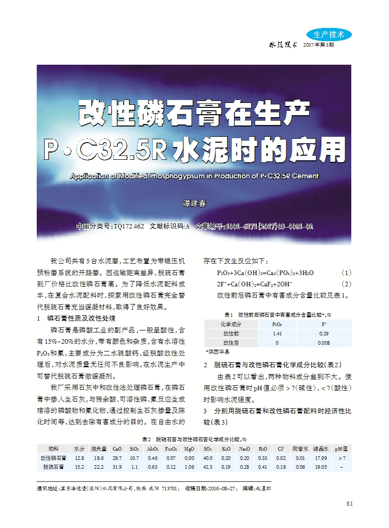 谭建春. 改性磷石膏在生产P·C32.5R水泥时的应用[J]. 水泥技术, 2017, 1(3): 81-82.