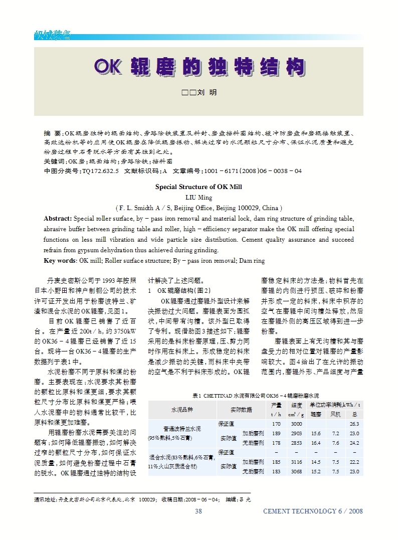 Abstract: Special roller surface, by-pass iron removal and material lock, dam ring structure of grinding table, abrasive buffer between grinding table and roller, high-efficiency separator make the OK mill offering special functions on less mill vibration and wide particle size distribution. Cement quality assurance and succeed refrain from gypsum dehydration thus achieved during grinding.