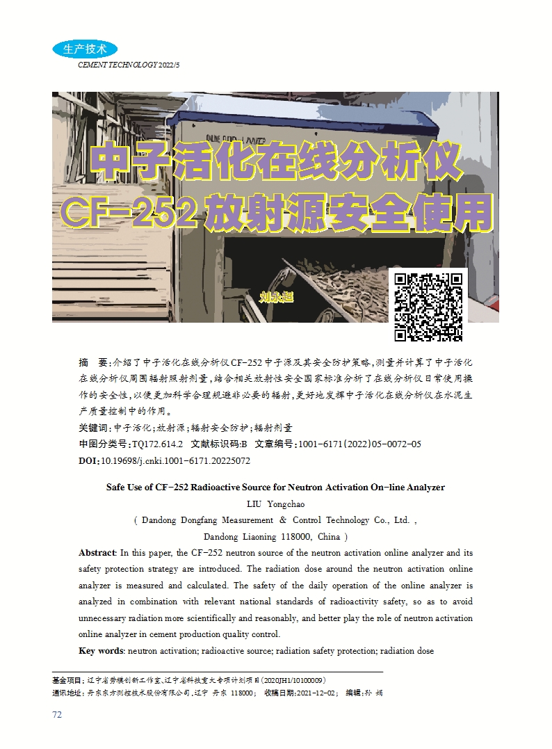 介绍了中子活化在线分析仪CF-252中子源及其安全防护策略,测量并计算了中子活化在线分析仪周围辐射照射剂量,结合相关放射性安全国家标准分析了在线分析仪日常使用操作的安全性,以便更加科学合理规避非必要的辐射,更好地发挥中子活化在线分析仪在水泥生产质量控制中的作用。