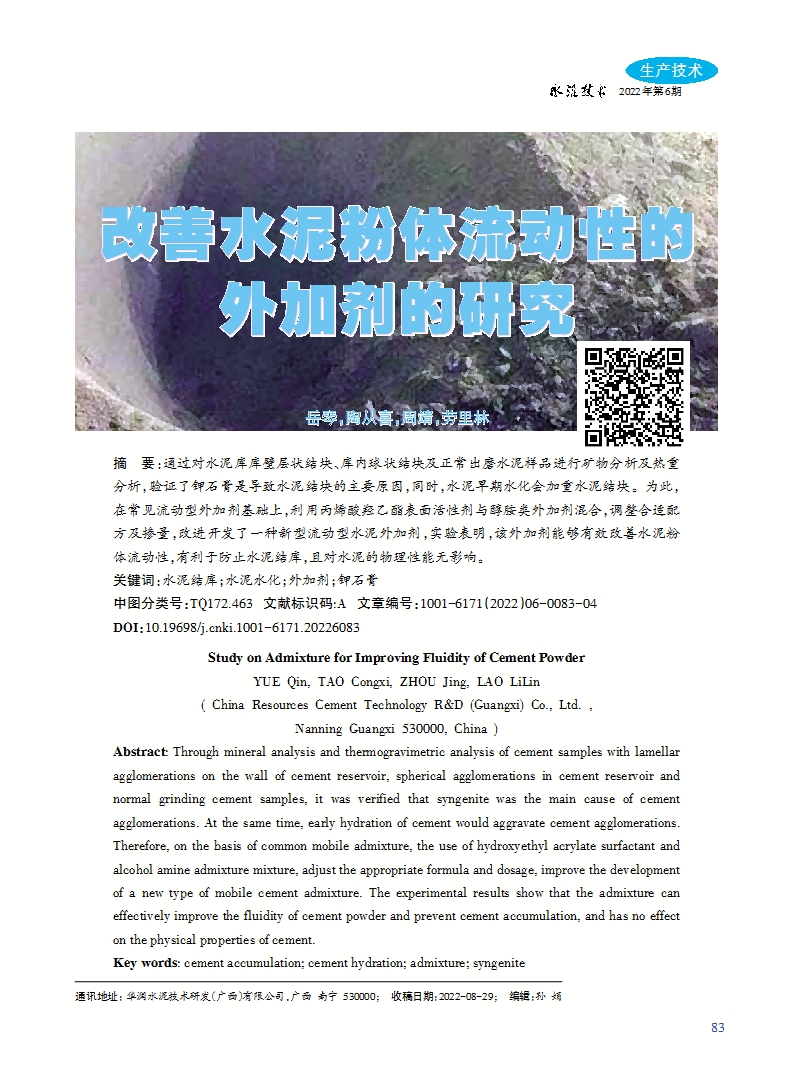 Through mineral analysis and thermogravimetric analysis of cement samples with lamellar agglomerations on the wall of cement reservoir, spherical agglomerations in cement reservoir and normal grinding cement samples, it was verified that syngenite was the main cause of cement agglomerations. At the same time, early hydration of cement would aggravate cement agglomerations. Therefore, on the basis of common mobile admixture, the use of hydroxyethyl acrylate surfactant and alcohol amine admixture mixture, adjust the appropriate formula and dosage, improve the development of a new type of mobile cement admixture. The experimental results show that the admixture can effectively improve the fluidity of cement powder and prevent cement accumulation, and has no effect on the physical properties of cement.