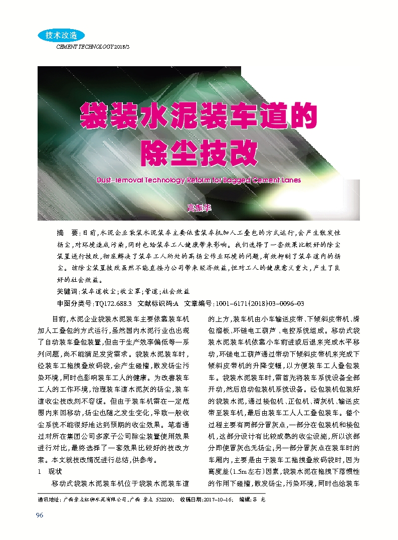 摘要 目前,水泥企业袋装水泥装车主要依靠装车机加人工叠包的方式运行,会产生散发性扬尘,对环境造成污染,同时也给装车工人健康带来影响。我们选择了一套效果比较好的除尘装置进行技改,彻底解决了装车工人所处的高扬尘作业环境的问题,有效抑制了装车道内的扬尘。该除尘装置技改虽然不能直接为公司带来经济效益,但对工人的健康意义重大,产生了良好的社会效益。