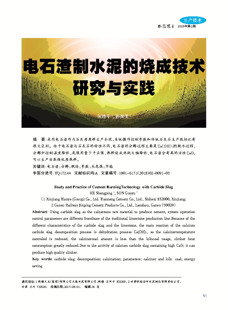HE Shengping , SUN Guoyu . Study and Practice of Cement BurningTechnology with Carbide Slag. Cement Technology, 2018, 1(2): 91-93.