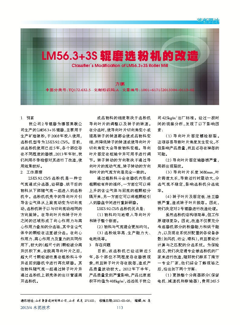 FANG Peng. Classifier's Modification of LM56.3+3S Roller Mill. Cement Technology, 2013, 1(4): 113-114.