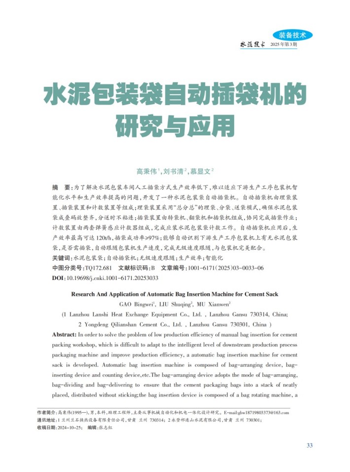 Research And Application of Automatic Bag Insertion Machine for Cement Sack
