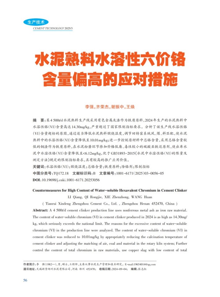 Cement Technology, 2025, 1(3): 56-60    doi: 10.19698/j.cnki.1001-6171.20253056