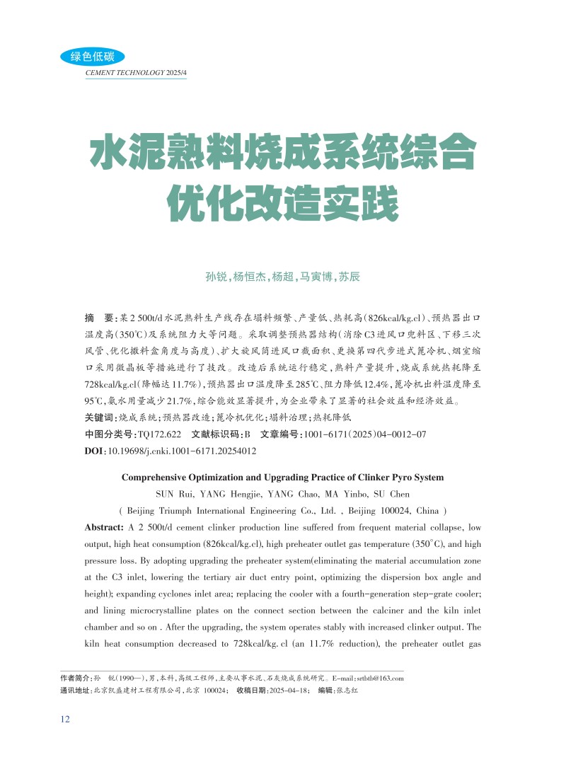 A 2 500t/d cement clinker production line suffered from frequent material collapse, low output, high heat consumption (826kcal/kg.cl), high preheater outlet gas temperature (350°C), and high pressure loss. By adopting upgrading the preheater system(eliminating the material accumulation zone at the C3 inlet, lowering the tertiary air duct entry point, optimizing the dispersion box angle and height); expanding cyclones inlet area; replacing the cooler with a fourth-generation step-grate cooler; and lining microcrystalline plates on the connect section between the calciner and the kiln inlet chamber and so on . After the upgrading, the system operates stably with increased clinker output. The kiln heat consumption decreased to 728kcal/kg.cl (an 11.7% reduction), the preheater outlet gas temperature dropped to 285°C, system pressure drop was reduced by 12.4%, and the outlet clinker temperature decreased to 95°C. Ammonia water consumption was reduced by 21.7%. Overall energy efficiency improved significantly, generating substantial social and economic benefits for the enterprise.